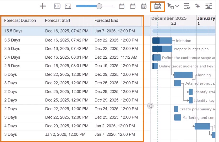 This command is available in both Table View and Timeline View and calculates forecast values for all tasks, milestones, and the project, based on the project’s configured Forecast Mode.