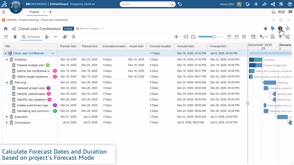 Forecast dates are dynamic. They are updated regularly based on current progress and performance trends and are used to predict when unfinished work is expected to be completed.