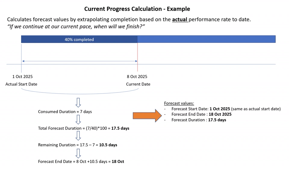 Calculates forecast values by extrapolating completion based on the actual performance rate to date. This mode answers the question: