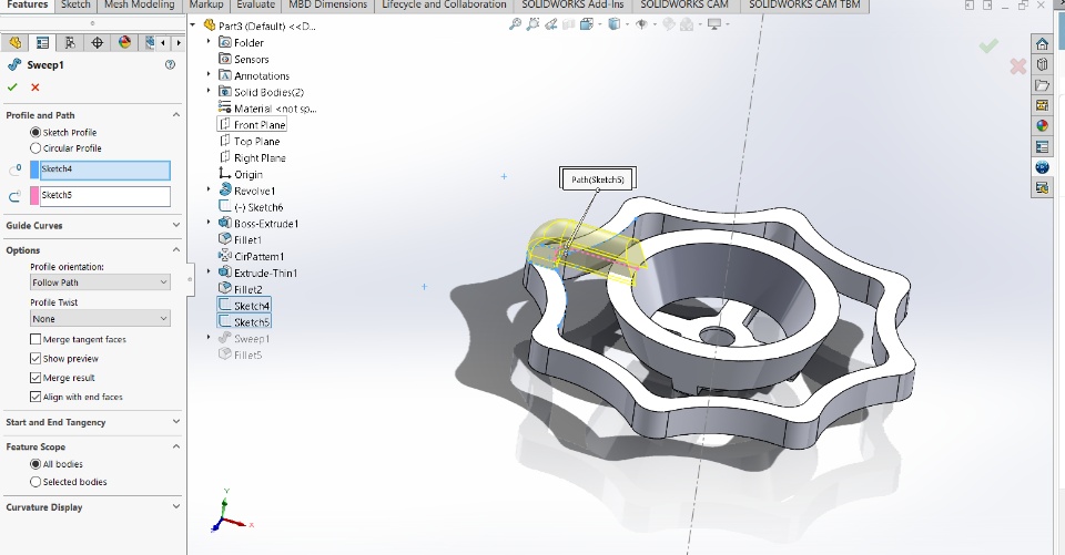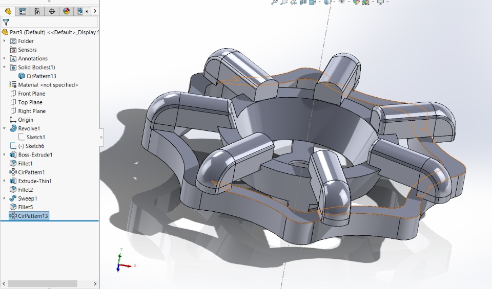 The pictures might be out of order, but if you look at the end of the arms, they should be at an angle rather than perpendicular to the top plane. Any ideas on how I can have every instance at an angle with just the sweep function alone?