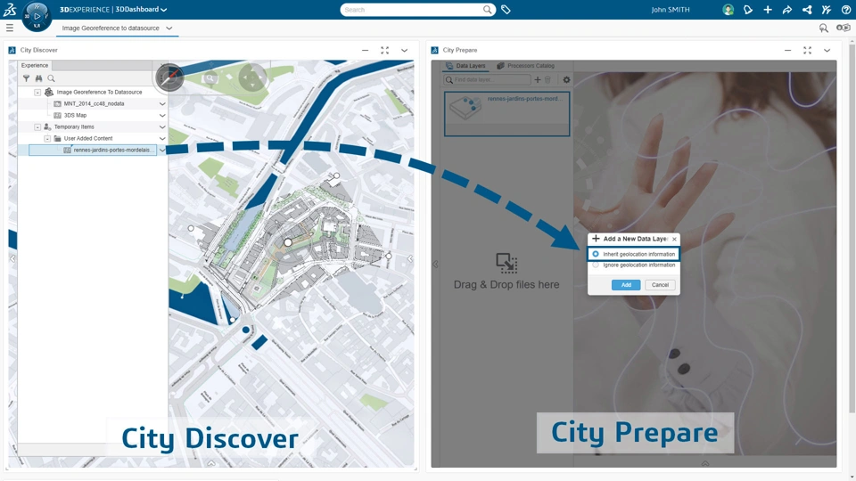 Once your image is correctly positioned in City Discover, open the City Prepare application. Select the data layer/object corresponding to your image, drag it into City Prepare, and choose the option to inherit geolocation information.