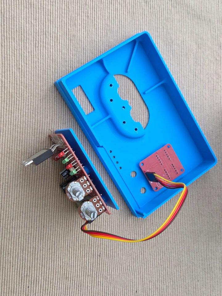 The case is recycled from an old car battery charger (a little zero-waste spirit ✌️ ) and all the custom parts: the front panel, PCB mount, covers, and brackets were 3D printed at  3DEXPERIENCE Lab Munich on a Bambu H2D with a smooth PEI plate.