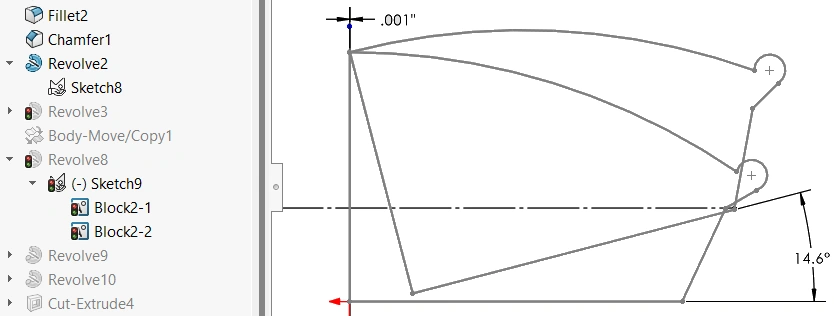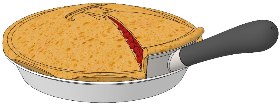 Then we modeled the pie... We knew we wanted the design to look like a piece was being removed, so we built a sketch of the pie's cross-section, then used sketch blocks to duplicate it and position it slightly raised out of the pie. We revolved one sketch block 315 degrees to build the bulk of the pie, and then revolved the other sketch block 45 degrees to build the slice that was being removed.