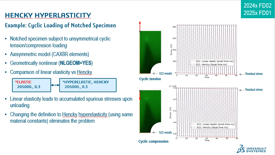 As the slide above says, the Hencky hyperelastic model was added in 2024x FD01 and 2025x FD01 to A/Std and A/Exp.  The motivation was NOT to have yet another material model for elastomers, it was to have a finite strain version of classical Hooke's law.