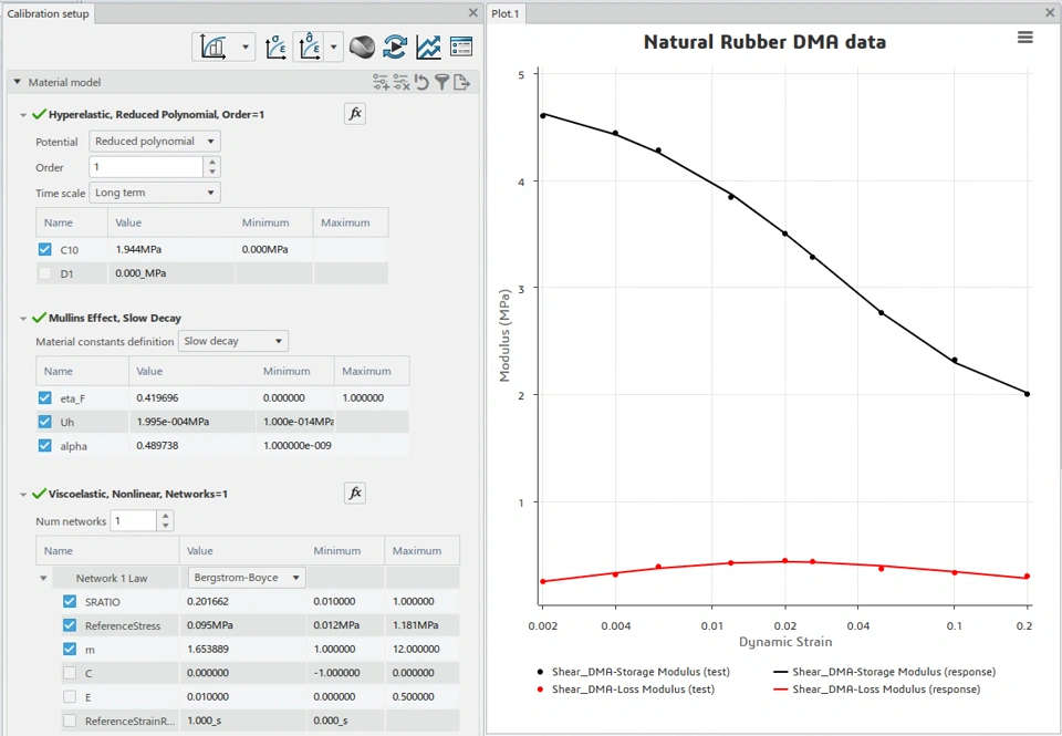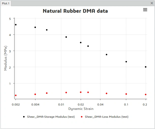 The image below shows the DMA test data loaded in the 3DX Material Calibration App. This data is from a dynamic amplitude sweep at constant frequency (1 Hz). The Material Calibration App requires that the dynamic strain amplitude (aka strain amplitude) be input as the "peak-to-peak" values.