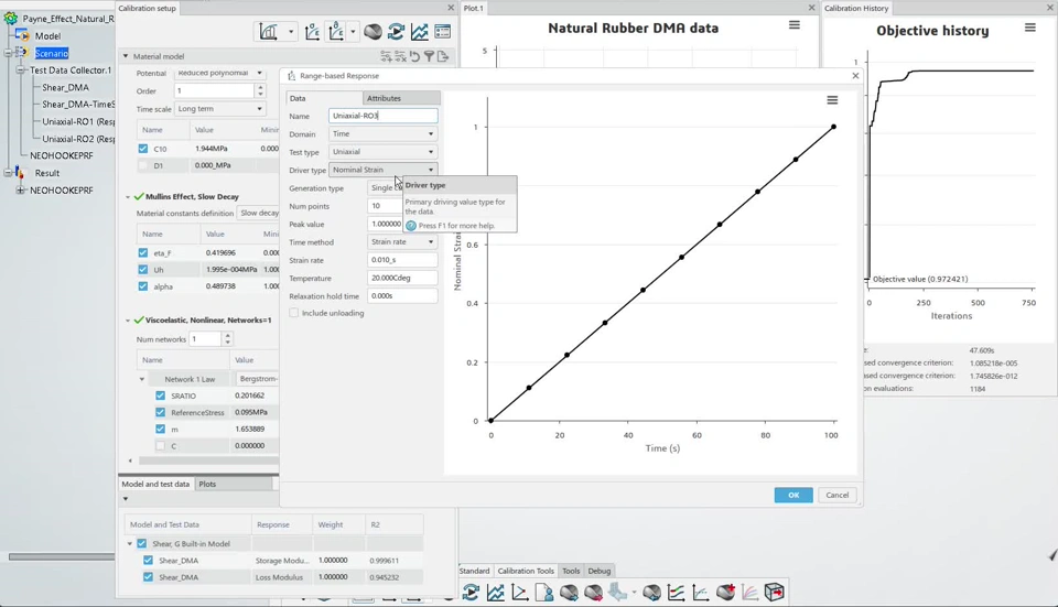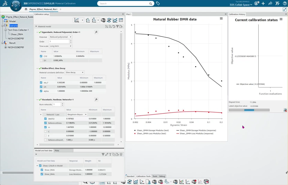 In the video below, we start from the "just data" 3dxml file and import a PRF-Mullins model as created by Stuart Nixon. Next we run a calibration. This video was created on Oct, 5, 2025 using a development version of the Calibration App that will become R2026x FD01 (release to public on Feb 7, 2026).