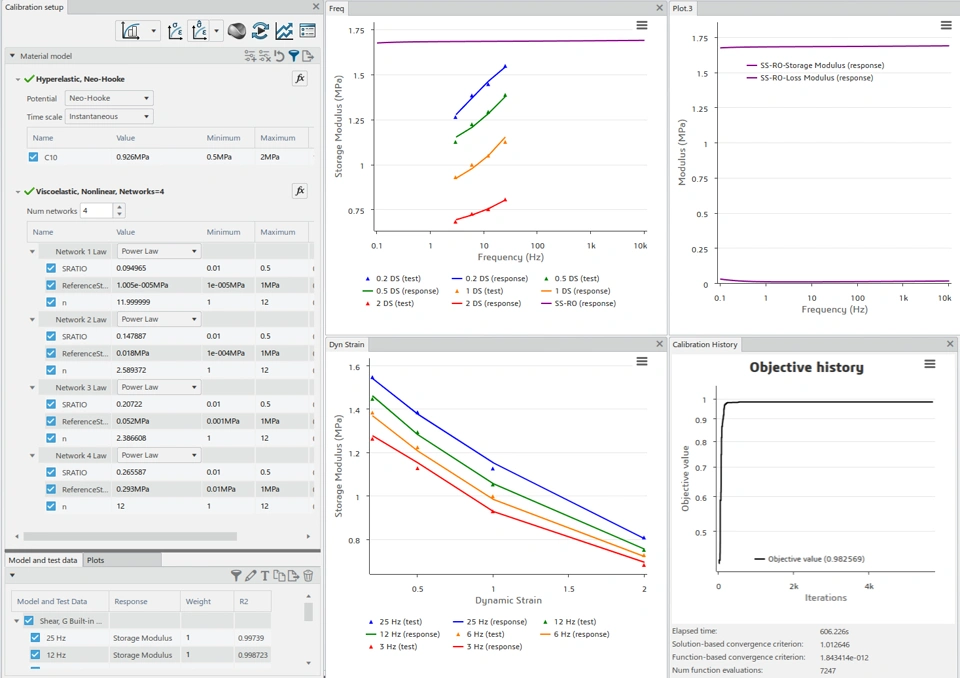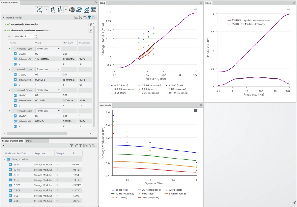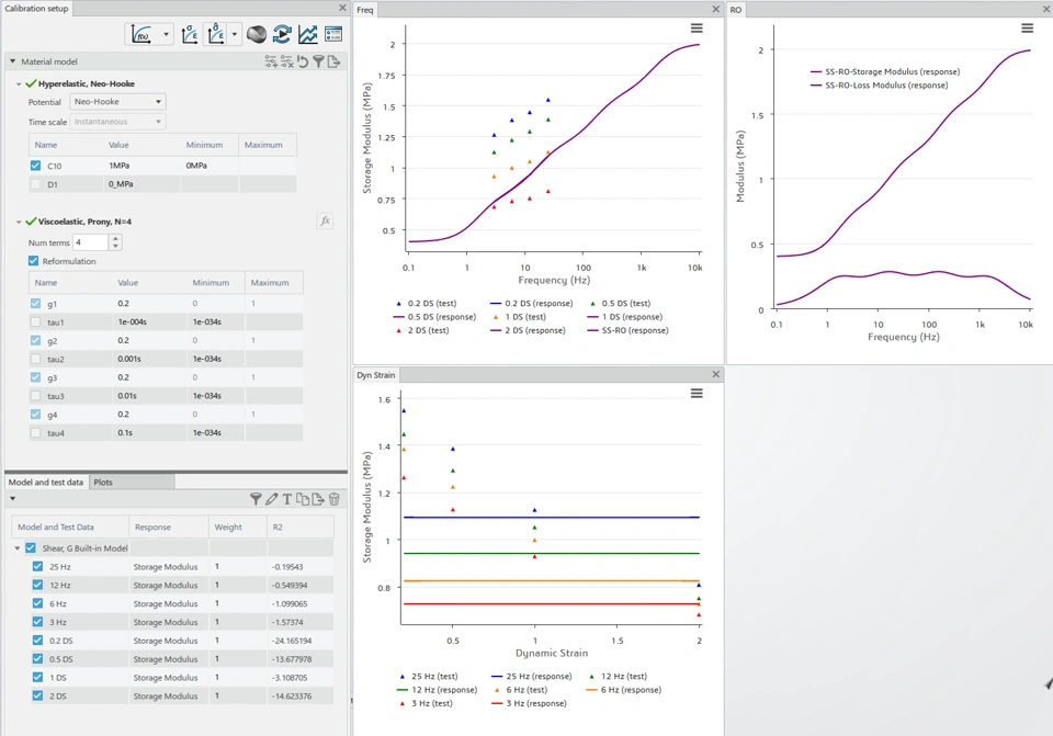 Calibration approach: Calibration of an advanced material model like the PRF model can be quite challenging. If possible, it may be helpful to approach the calibration incrementally. We do know that the Prony series can capture the frequency dependence of the storage and loss modulus, so an idea is to first perform that calibration to help identify some of the parameters, or at least "get in the ballpark". This image below is the calibration of the Prony series model, using R2026x FD01 (HotFix 1.34). This Prony work was done using the analytical mode since it is very fast. In analytical mode, the hyperelastic part must be the instantaneous modulus. The data was imported from Excel twice, using the different groupings to allow for creation of the two styles of plots. The SS-RO (Response Only) data and plot (upper right) was added to see the peak in the loss modulus versus frequency. This SS-RO data is at 0.001 dynamic strain.