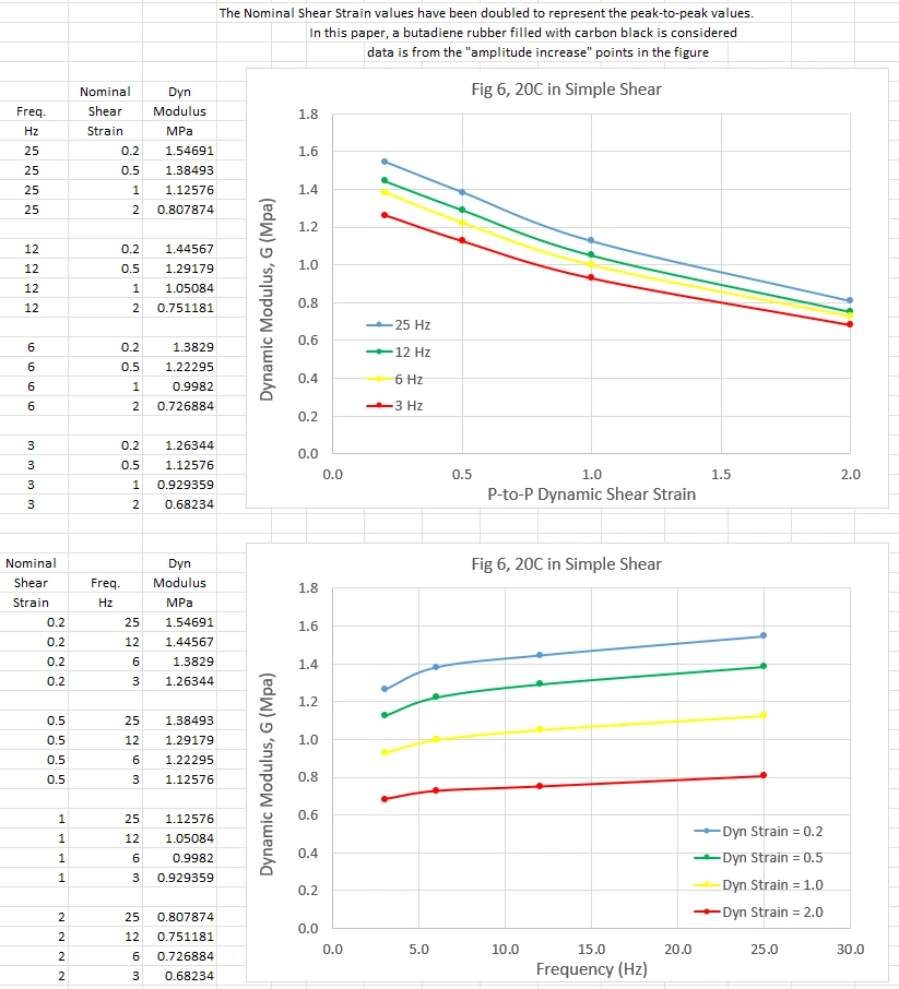 The test data is attached in an Excel file. The paper only showed storage modulus, not the loss modulus or tan delta. The Excel file shows the data arranged in two different groupings, in order to make the two plots shown.