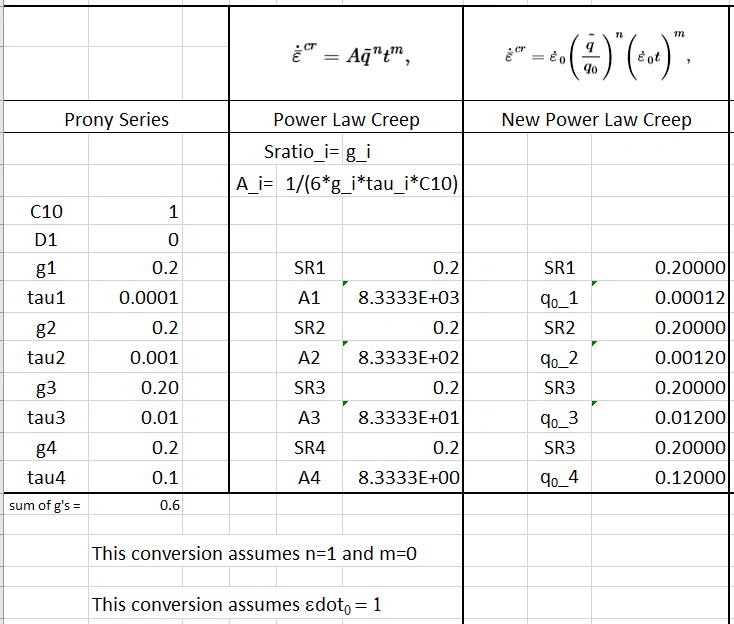After creating a 4-term Prony series model that generally captures the frequency dependence of the storage modulus, I map the Prony parameters to a set of degenerate 4-term PRF parameters. Since it is degenerate, I expect the degenerate PRF model response to match the Prony response. Here I have chosen to use the New Power Law creep model. It is helpful to turn plotting off as you enter the PRF parameters.