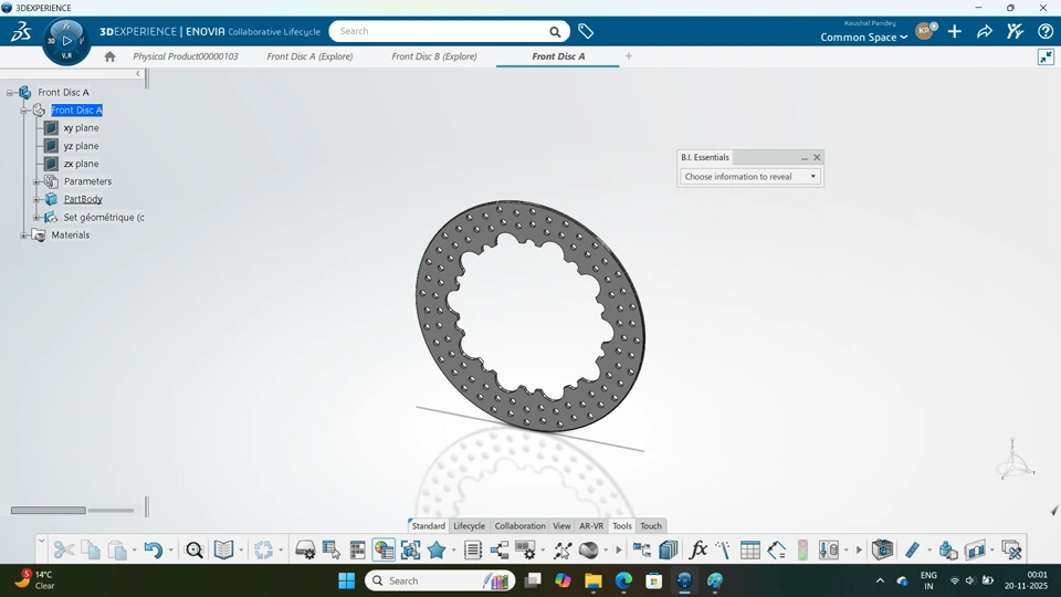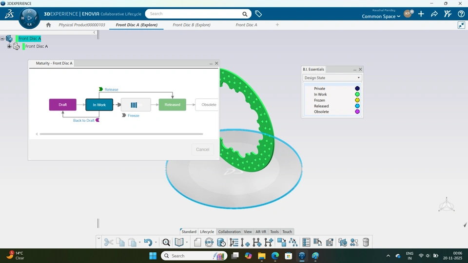The BI tools shows the design state option in the Front Disc A (explore) tab. Even if change the maturity (from in-work to freeze) in the lifecycle option, the design state in BI tools remains the same, i.e. green.