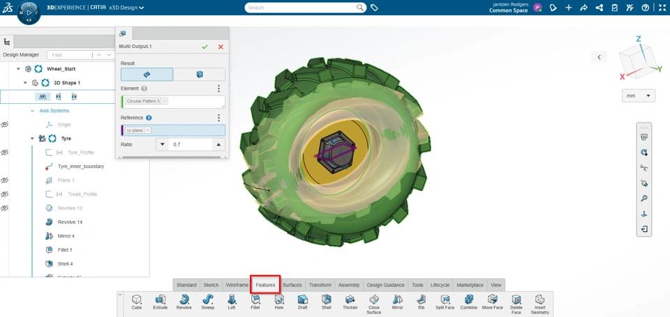The instruction video shows scaling the wheel with a scale tool in the features section. This tool allows the instructor to select origin as a reference and there is no selection for a surface or volume output.