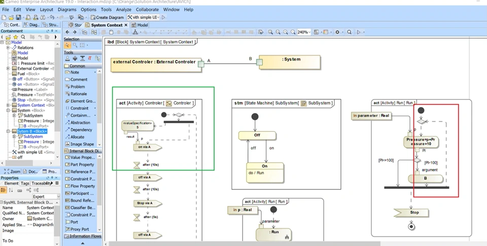 1. The cycle marked in red in the activity diagram on the right below, Pressure=p+Pressure+10, doesn't the activity node have to wait for in paramter: real to receive data before it can be executed? Why is it that in this video, only the green marked activity icon ON via A on the left needs to be executed once, and during the waiting 10 seconds, the red marked loop on the far right will continue to execute? How can this be achieved in magic draw?