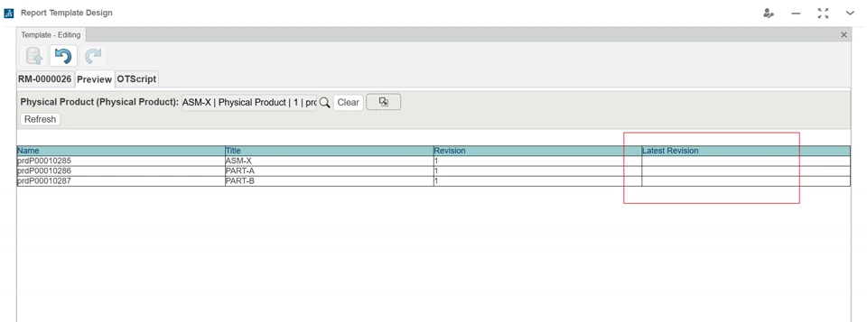 As shown in the image below, the report currently displays parts used in the assembly, including older revisions. However, my requirement is to also display the latest revision of each part alongside the existing part in the report. Please refer to the attached snapshot of the current report template for reference.