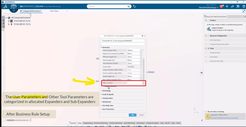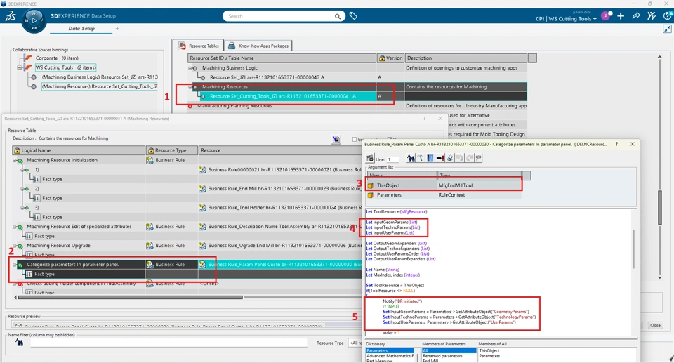 I deployed several Business rules in Machining Resources and Machining Business Logic using Data Setup App, following the instructions in the Wiki EKL Script Customization for DELMIA Fabrication ( Business Rule to Categorize Parameters in Parameter Panel)