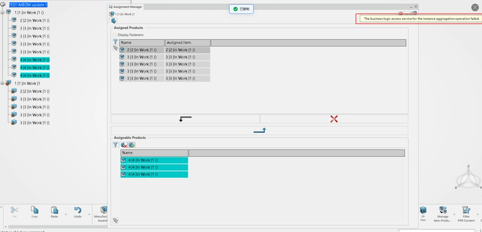 I reused the "Assignment Manager" or "Create/Update Item Structure" under the current PPR to rebuild the MBOM structure tree, but the system reported an error: "The business logic access service for the instance aggregation operation failed."(fig 4)