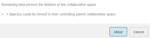 I’m platform admin and Leader/Owner of a collaborative space on a 3DEXPERIENCE cloud tenant, and I’m trying to delete this CS that looks completely empty: when I search with Collaborative Space = this CS and all types / all maturity states, no objects are found. But when I delete the CS I get the message “Remaining data prevent the deletion of this collaborative space – 1 object(s) could be moved to their controlling parent collaborative space”, and when I click Move I get “Some errors occured while cleaning collaborative space: Invalid Collab Space. Invalid Owner. Invalid Organization.” It looks like there is a “ghost” object still attached to this CS that I cannot see or move from the UI. Has anyone faced this and knows how to identify/clean that hidden object so the collaborative space can be deleted?