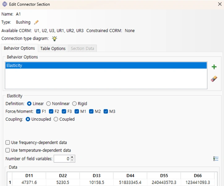 Q2. For connector elements (type: bushing or Cartesian+Cardan), is it possible to set the input values D11, D22, D33, D44, D55, D66 as design parameters, and the nodal displacement value as a design response for DSA?