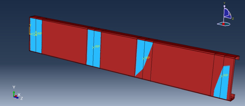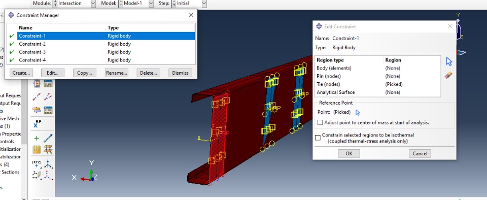 I am working on a 4-point bending test on a channel section (deformable shell element) where load has to be applied through web plates (rigid-body element). I tried using surface to surface contact between channel section and web-plates with penalty friction coefficient of 0.4. I tried connecting the reference point and web-plates through a rigid body constraint (Tie).