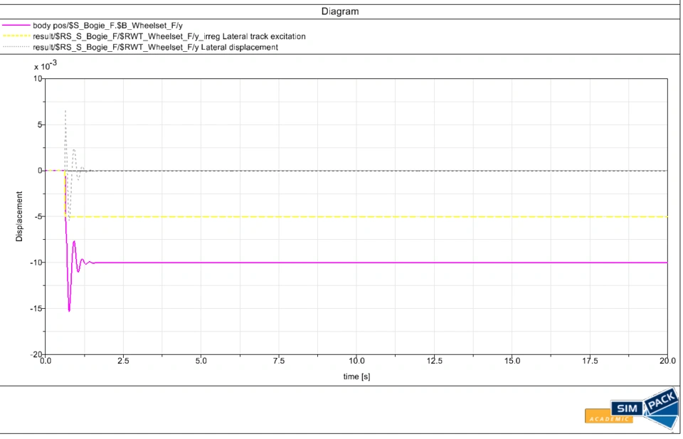 I am currently replicating Manchester benchmarks vehicle 1 in Simpack rail. During this work I faced a problem in the simulation or postprocessing of the results. I have generated Track 2 simulation case, where a step excitation of 5mm is induced to the tracks (picture below). Otherwise, the track is straight.  In the postprocessing I get a results that my lateral track excitation is 5mm, and my wheelset lateral displacement gets an impulse at the location of the track excitation, and the oscillation dampens away. This is correct behaviour. However, my wheelset body position converges to 10mm, which can not be true. For the wheelsets the BRF markers are located in the mass center, and the track is straight, so the body position should converge to 5mm. The same 10mm converged result is obtained for other vehicle bodies as well.  My question is, how can I obtain the correct displacements of bodies with respect to track in this software?