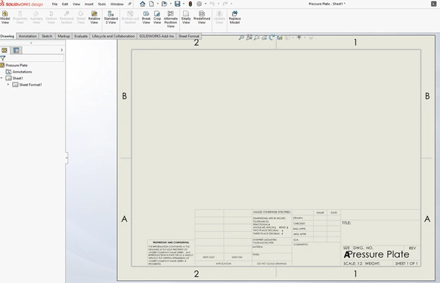 SOLIDWORKS creates a drawing using the A (ANSI) Landscape sheet format.