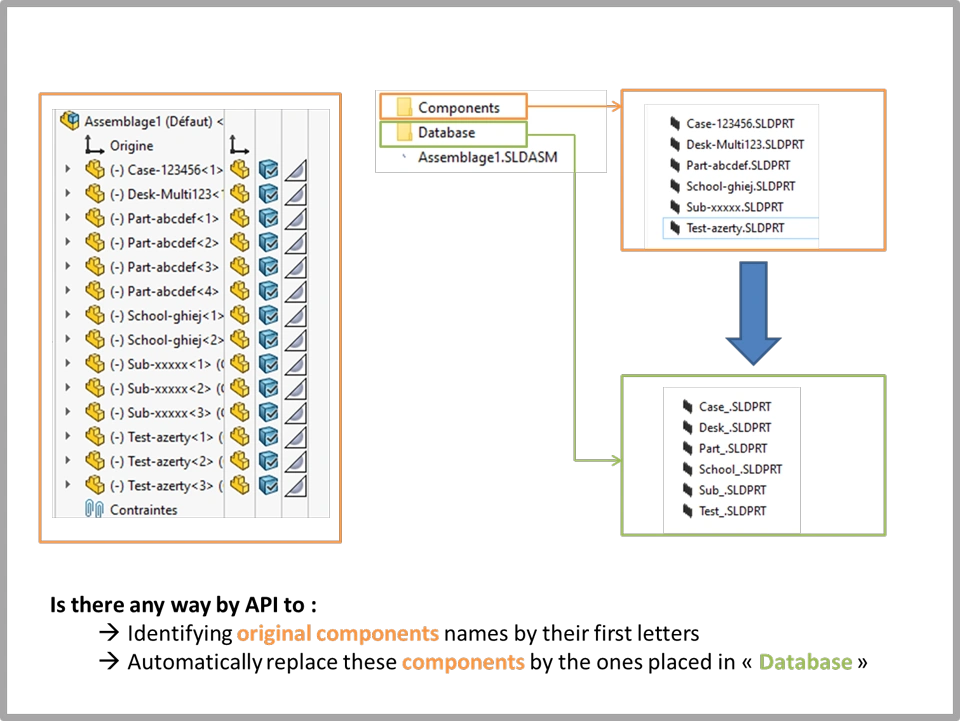 - Identify the parts, coming from Components, in Assemblage1.SLDASM and replace them by those present in Database ?