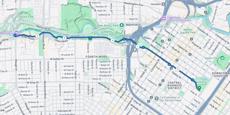 - Route : We'll head up Lamar Street (bike lanes and sidewalks) to the park along Buffalo Bayou. Great turn arounds available for 3, 5 (Waugh Dr), and 7 (Sheppard Drive) miles on an out and back.