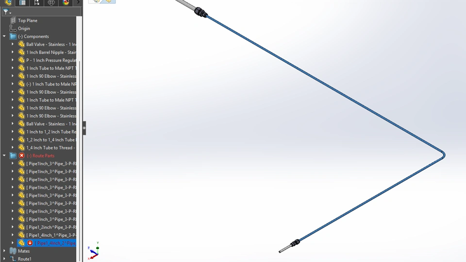 We are using compression fitting elbows so I made my own custom elbow with the 3 sizes being used as different configurations and the design table is all set up correctly. The 1" elbows work with no issues and at the moment (as you can see in the screenshot) the 1/4" elbow is in place as it should be. The problem I am having is that as soon as I try and add the final component or make any other changes to the route the elbow breaks which I will try and show with screenshots below.