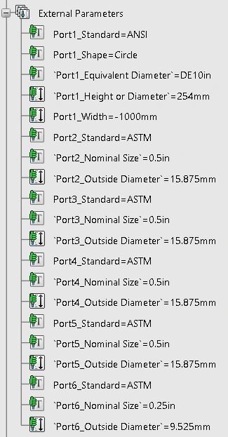 Configurable port parameters that control the geometry of the piping ports and spigot.