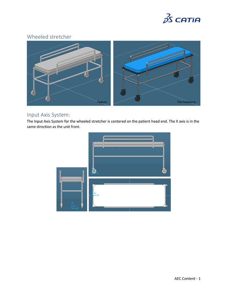 The Input Axis System for the wheeled stretcher is centered on the patient head end. The X axis is in the same direction as the unit front.