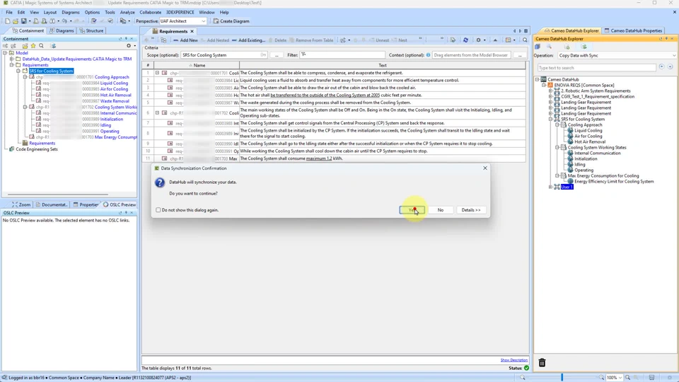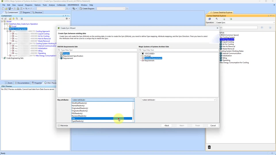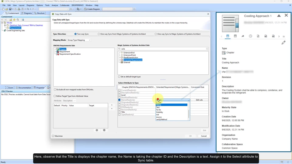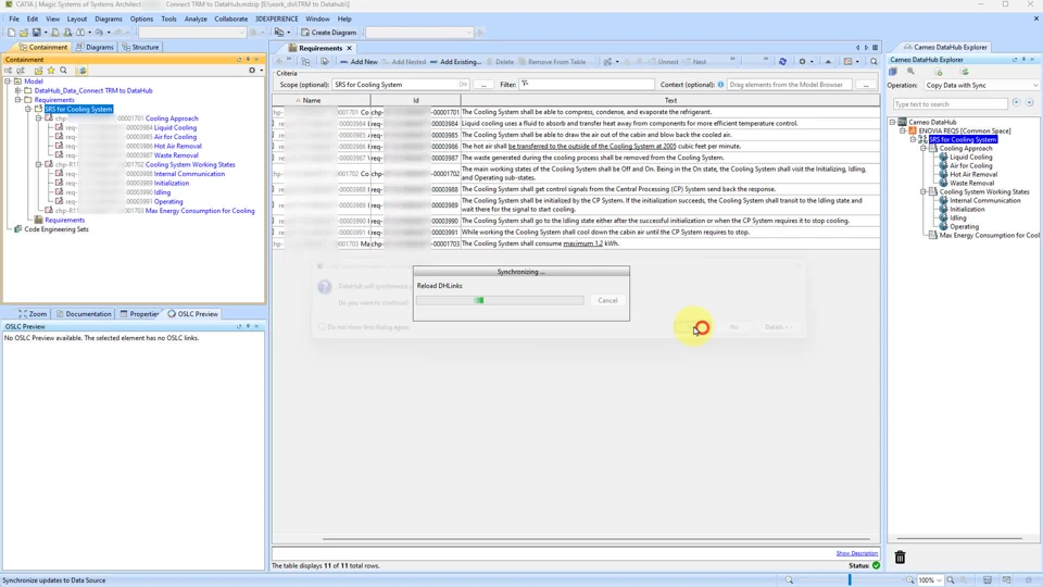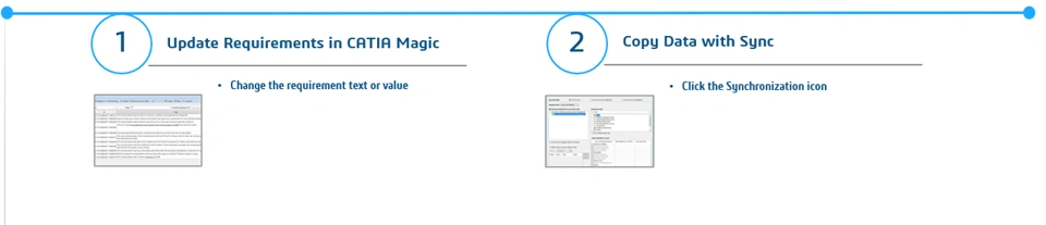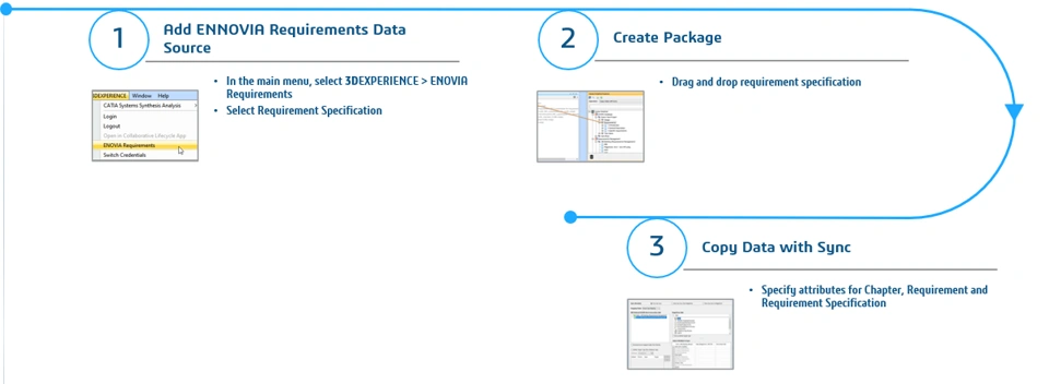 Prerequisite Roles:3DSwymer (IFW-OC), Collaborative Industry Innovator (CSV-OC), Magic Cyber Systems Engineer (MAH), Requirements Engineer (TRM-OC), DataHub Plugin Step 1: Capture Requirements from ENOVIA Requirements to Cameo DataHubStep 2: Copy Data with Sync Operation from ENOVIA Requirements to CATIA MagicStep 3: Update Requirements from CATIA Magic to ENOVIA RequirementsStep 4: Update Requirements from ENOVIA Requirements to CATIA MagicStep 5: Create Sync Operation Between ENOVIA Requirements to CATIA Magic |