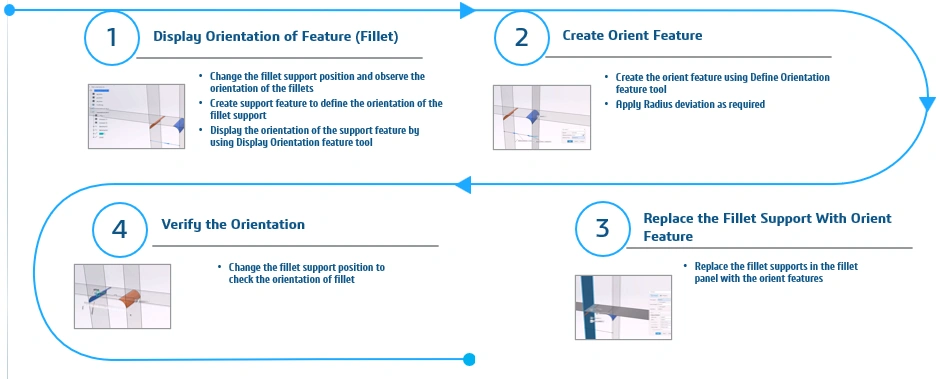 Scenario: Let us see a scenario where you want to control the orientation of the fillet.The Define Feature Orientation tool allow to create orient feature, which further can be used to update the orientation of the fillet surface more efficiently.