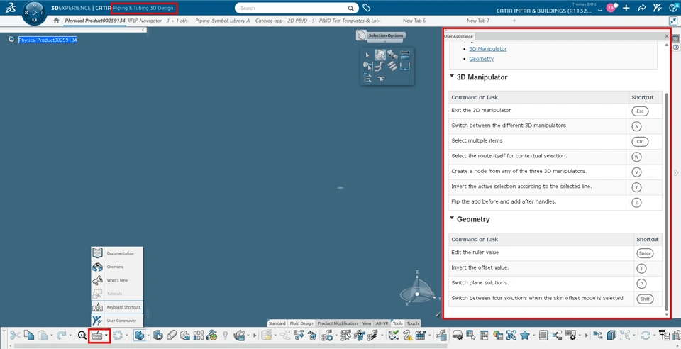 • the CATIA 3DEXP common menu for all App:? / HELP / Keyboad Shortcuts