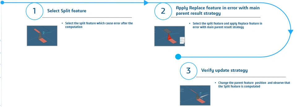 Scenario: In a 3D design, if you have the split operation performed on the surface using a reference plane feature, during updation of reference plane, the child feature split fails. Using the Replace feature in error with main parent result startegy, the child feature error is replaced with parent feature.