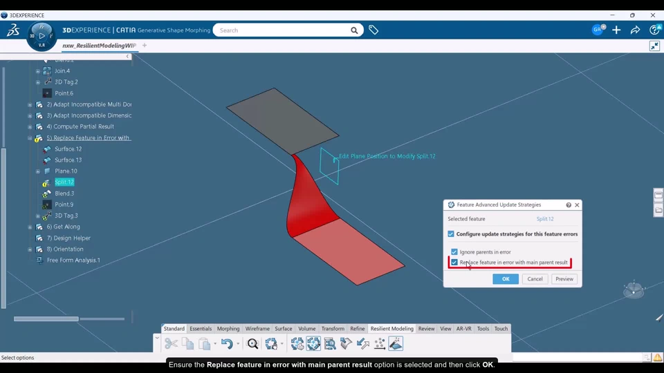 This technical practice documents the 3D Shape update strategy, Replace feature in error with main parent result within Resilient Modeling. When a feature fails to compute, this strategy copies the result of the main parent input to the current feature. The specifications of the failed feature are ignored and the geometry of the first input is used as the resulting output.
