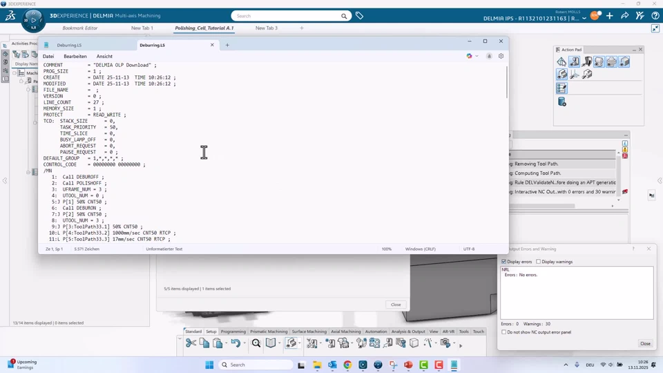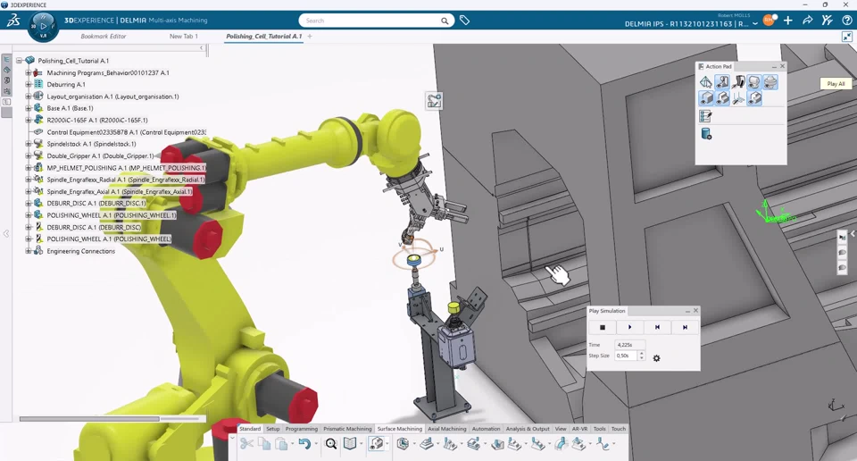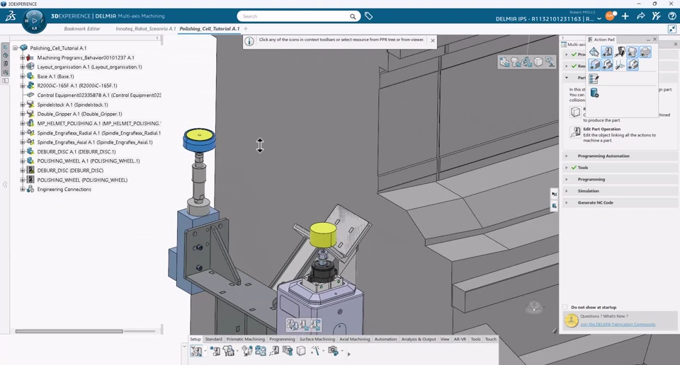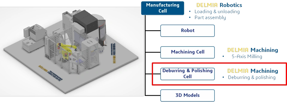 This scenario was originally concieved for the Innoteq trade show 2025. It combines Delmia Machining & Robotics to implement a fully automated production cell. The scope of this tutorial is limited to the Deburring & Polishing Cell.