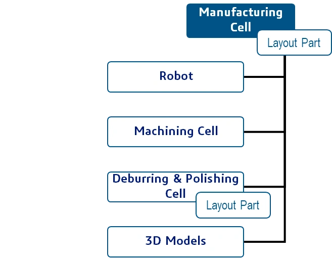 To make sure the positioning of the different objects within the cells is consistent a common part (Layout Part) is shared between the cells. This part contains coordinate systems defining the positions of all objects present in the cells. It´s first defined when planning the layout of the entire cell (top node) and is then reused when building the cell for Deburring & Polishing.