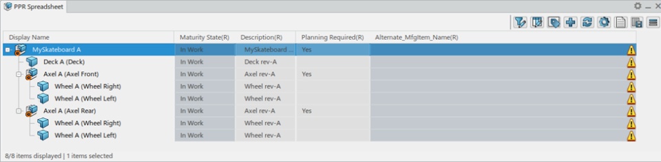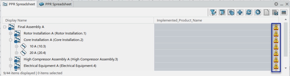 When the tree structures becomes too big, it becomes difficult to traverse the links from operation to implemented Mfg. items and from Mfg. items to implemented Eng. Items. We can use Spreadsheet Editor to see a nice and clean tabular view of the PPR structure.