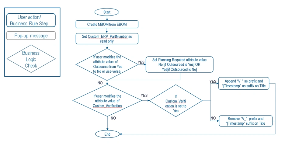 - When an attribute like Custom_ERP_PartNumber is copied from the EBOM (Engineering Bill of Materials) to the MBOM (Manufacturing Bill of Materials), it should become read-only at the MBOM level. This prevents the user from modifying the value at the MBOM side.