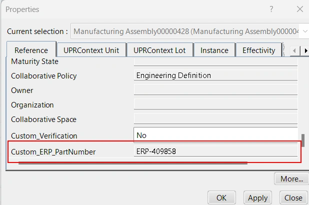 Custom_ERP_PartNumberattribute, which was copied over from the EBOM, will be set as read-only in the MBOM. This prevents the user from modifying theCustom_ERP_PartNumberat the MBOM level, ensuring that the part number remains consistent with the original EBOM.
