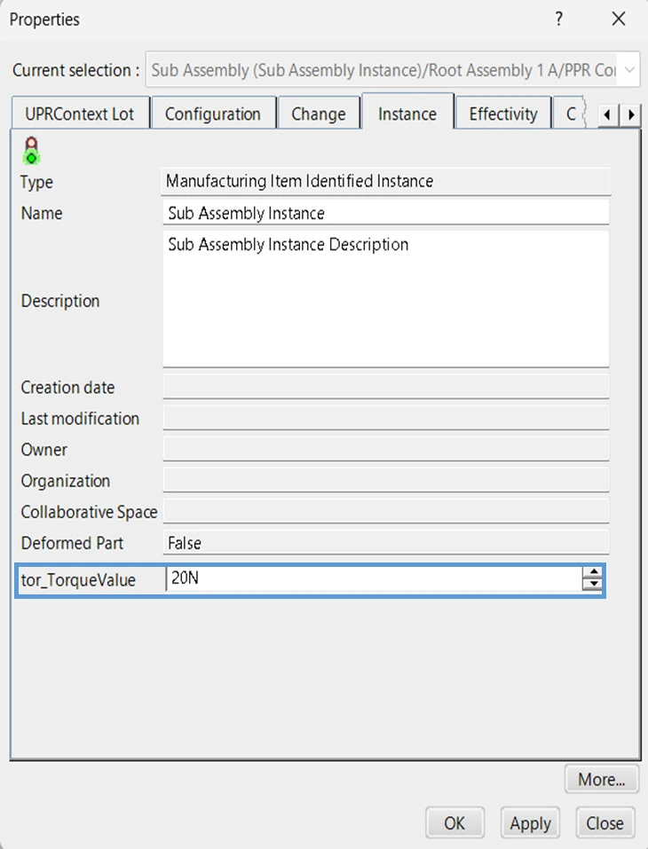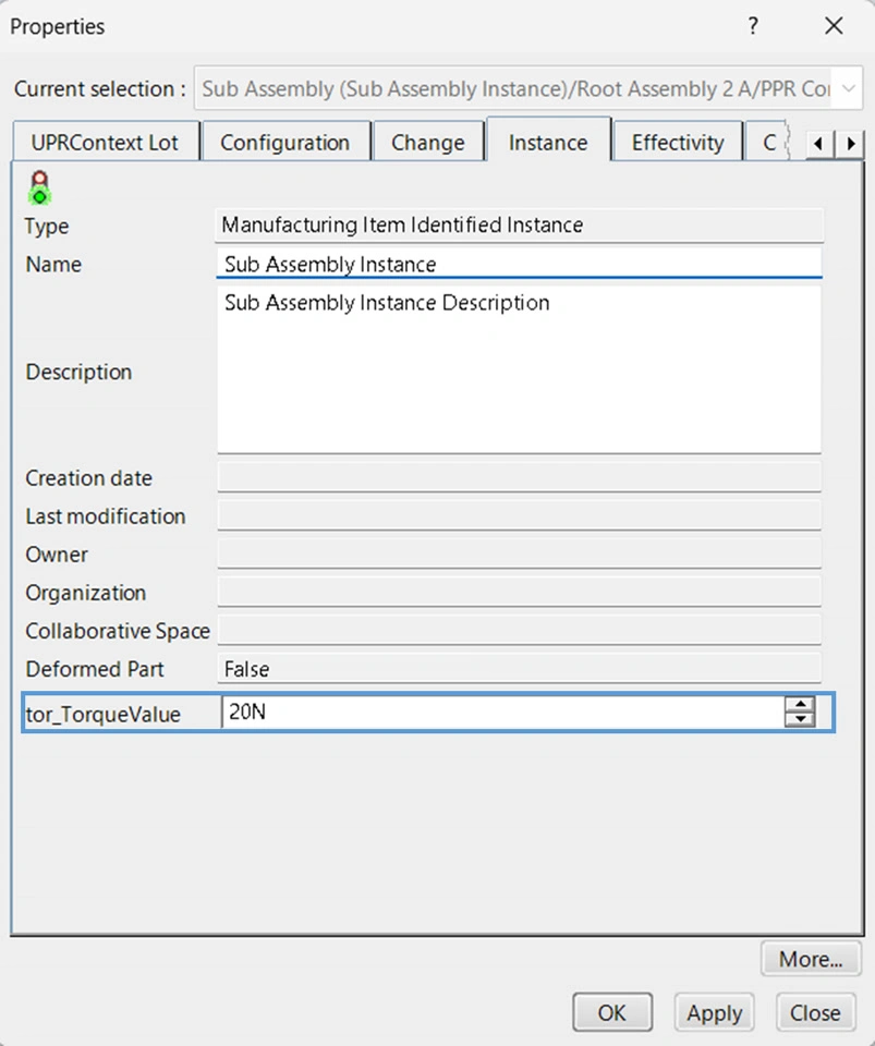 In this example we are using a custom attribute "tor_TorqueValue" which is present in the instance information of an Mfg. Item.