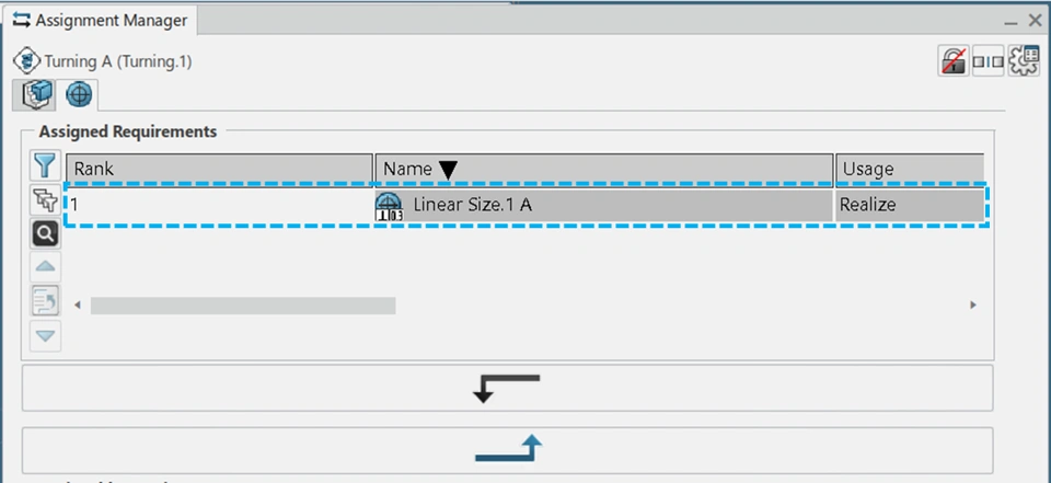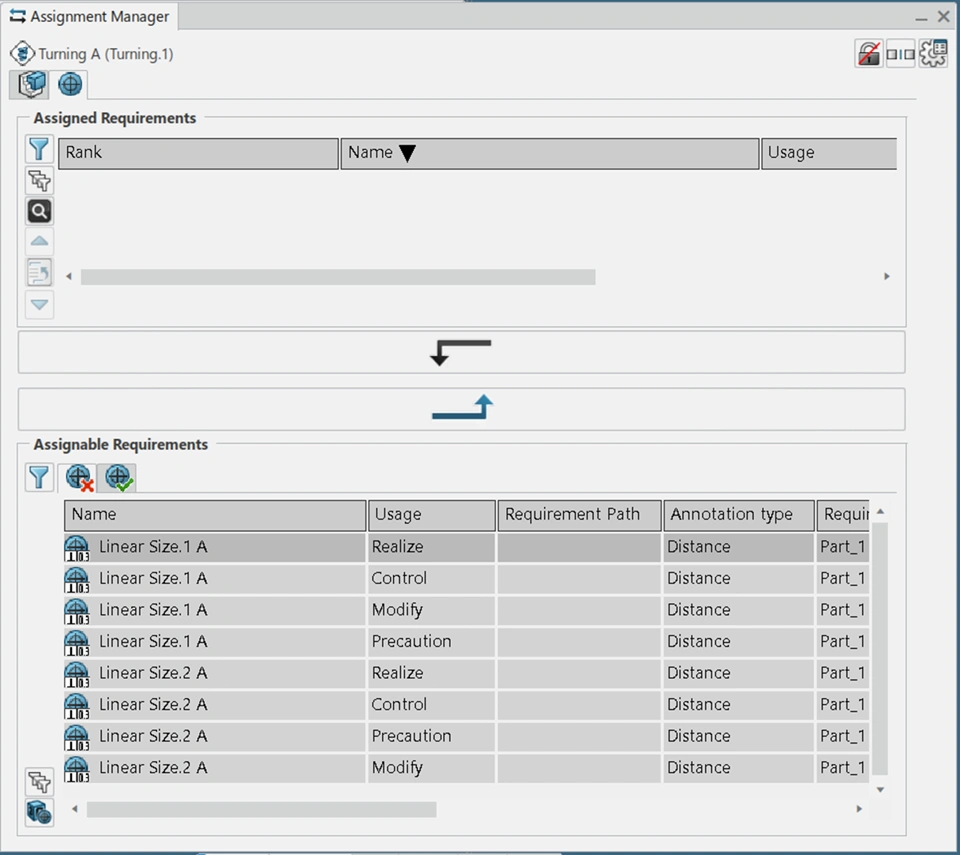 Let’s assign the “Realize” usage (OOTB usage with allowed number of assignments in a structure = 1) of the “Linear Size.1 A” requirement to the “Turning” operation as shown below:
