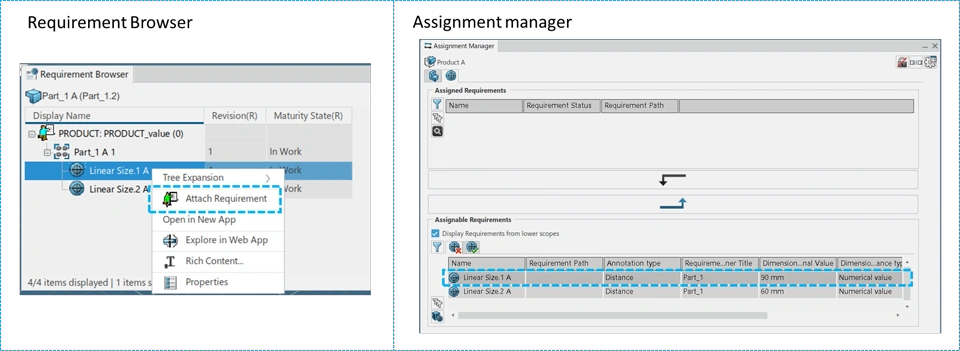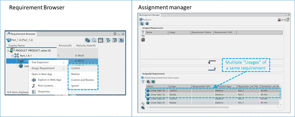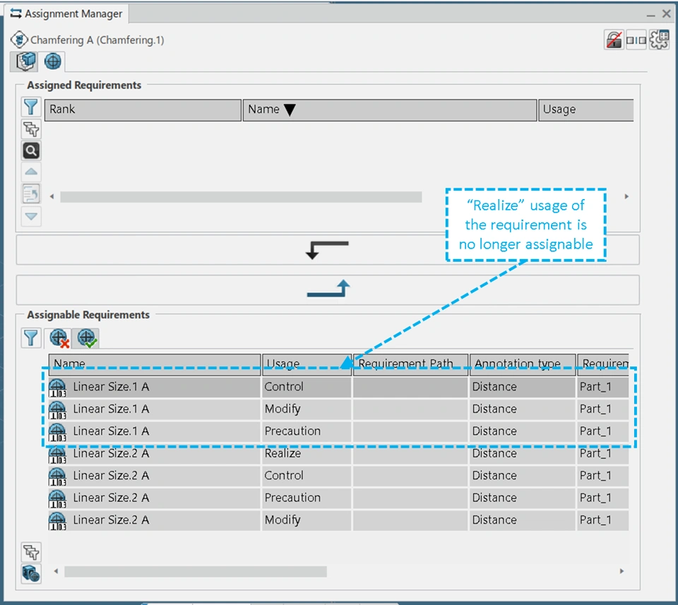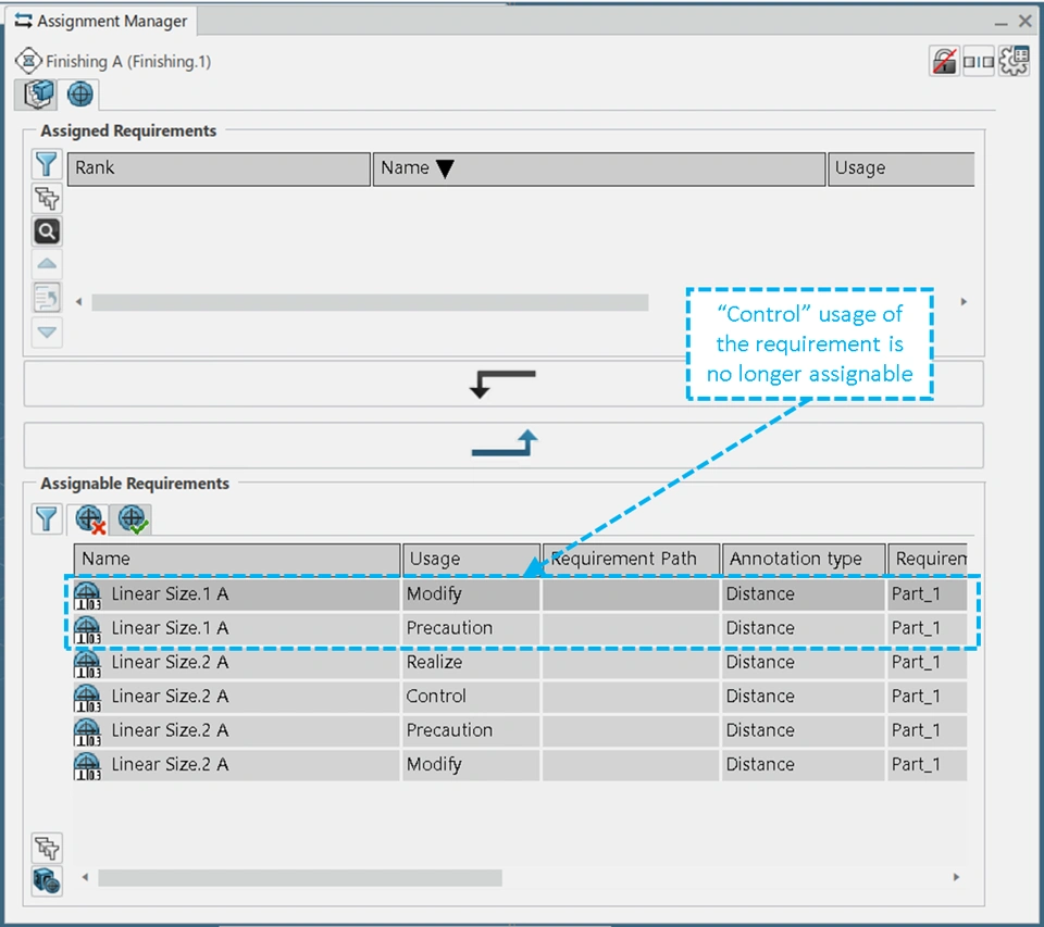 Now the “Control” usage of the requirement “Linear Size.1 A” will be no longer available for additional assignments as shown below: