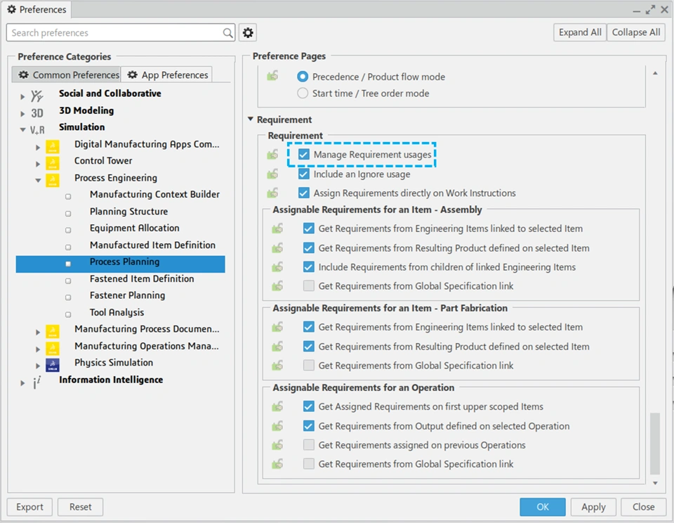 Requirements can be assigned to Manufacturing Bill of Material (MBOM) objects like Manufacturing Assembly, Provided Part etc. and Bill of Process (BOP) Objects like Operations (General Operation, Loading Operation) etc.
