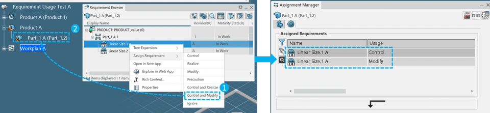 Note: By default, based on usage - A “Control” requirement can be assigned on two Mfg. Items in Item structure and two Steps/operations under a workplan/System simultaneously. A “Realize” requirement can be assigned on single Mfg. Items in the Item structure and single Steps/operations under a workplan/System simultaneously. (Applicable for both "Part Fabrication" and "Assembly" scenarios.