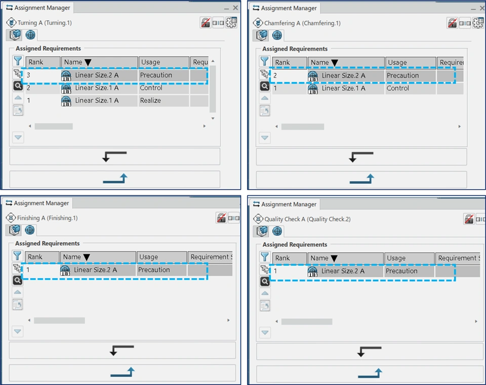 Let’s assign the precaution usage of the requirement “Linear Size.2 A” to all the machining operations and to the “Quality Check” Operation” as shown below: