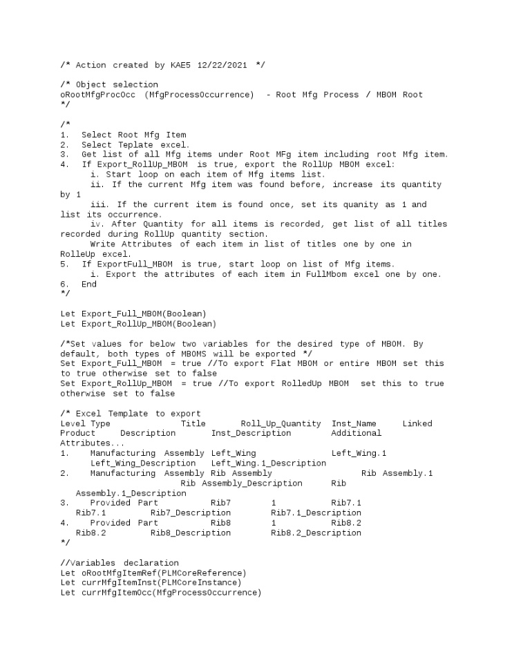 Set Export_RollUp_MBOM = true //To export RolledUp MBOM set this to true otherwise set to falseFor example, if user don’t want to export Full MBOM, "Set Export_Full_MBOM = false"