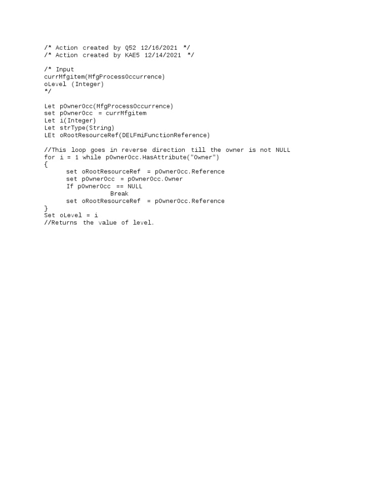 scrGetMfgLvl.Run(currMfgItemOcc, lvlMfgItem) // Get its level and set inside the excel sheet"lvlMfgItem" will have value of level after execution of action file.
