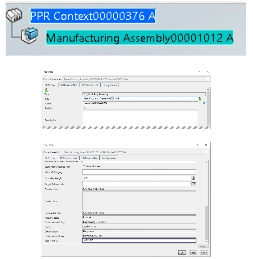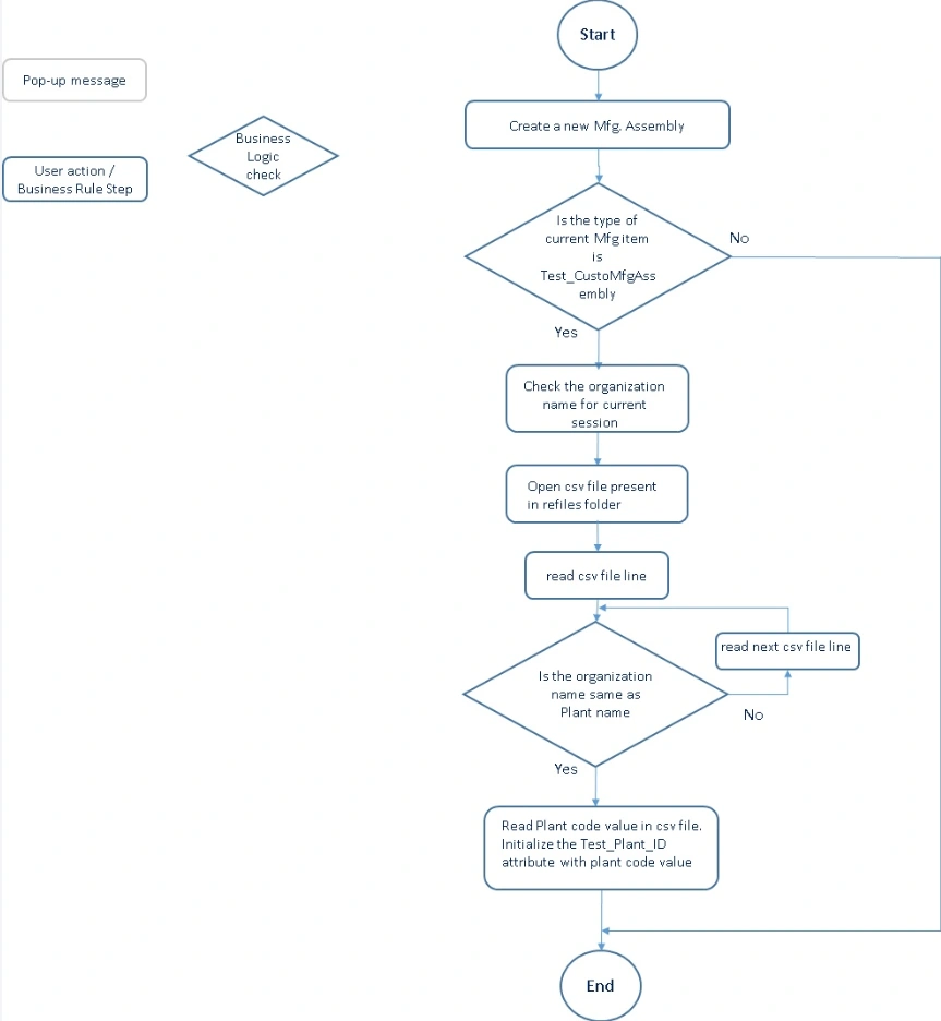For example if the user has logged in with organization ‘”Barcelona”, when user creates a new object of type ‘Test_CustoMfgAssembly’ the BL reads the ‘Plant ID’ value for each row in the csv file. When the Plant Name matches “Barcelona” the attribute ‘Test_Plant_ID’ will be set to value “4502”.