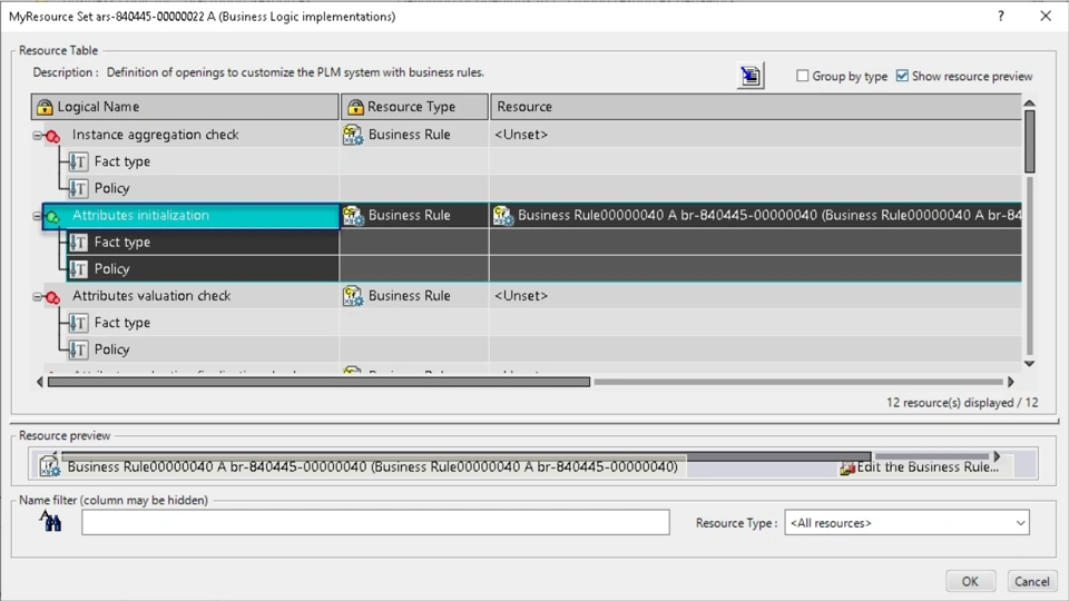 For different Resource types and Engineering items (Products/ parts) the type ‘VPMReference’ and script ‘ENONT_PLMReference_BLInitialization.CATRule’ can be used for customization.