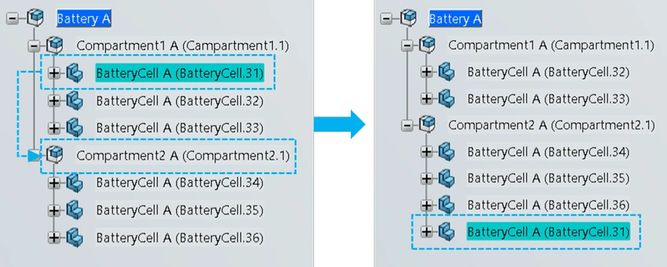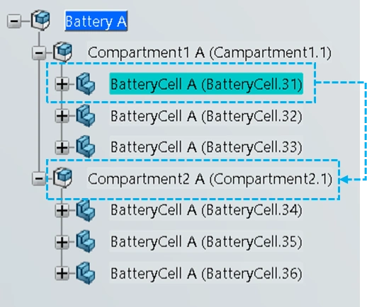 If the 3DPart "BatteryCell.31" instance is dragged and dropped from "Compartment1" to "Compartment2" as given below: